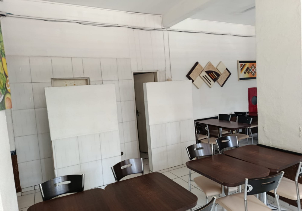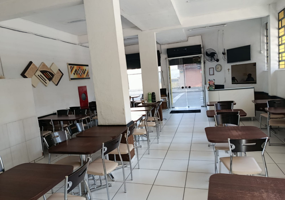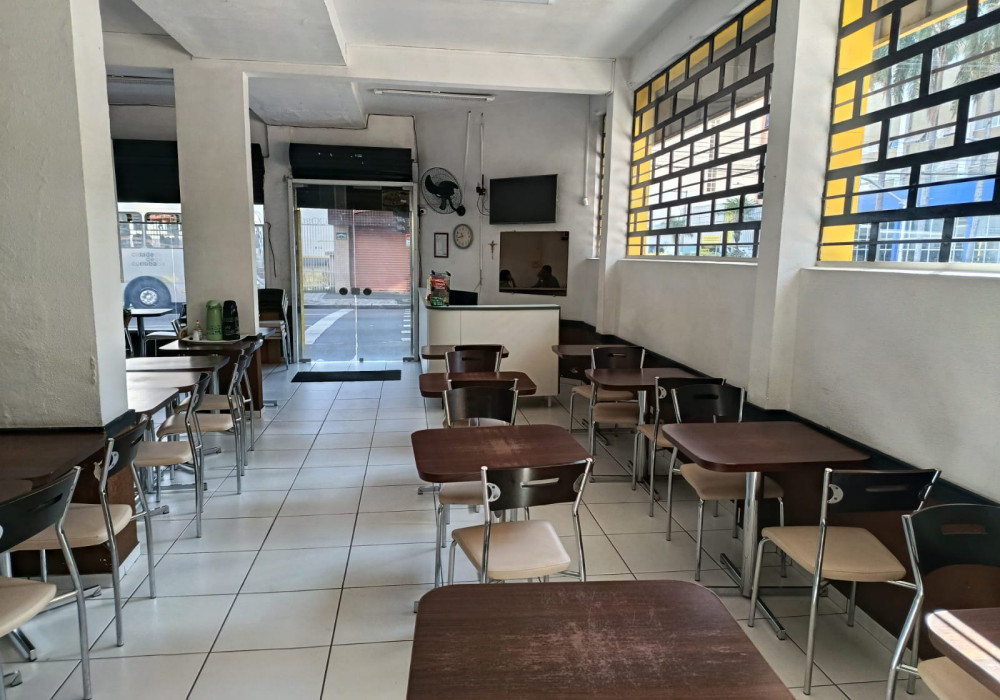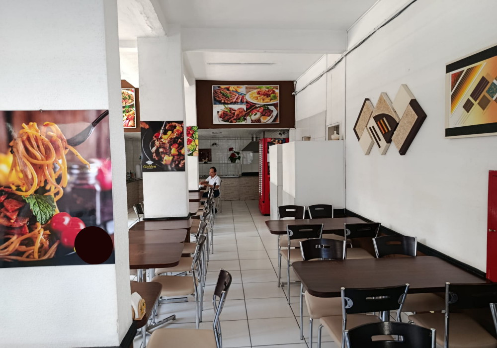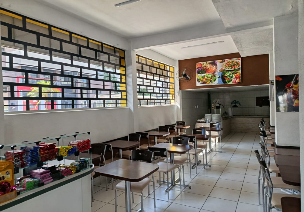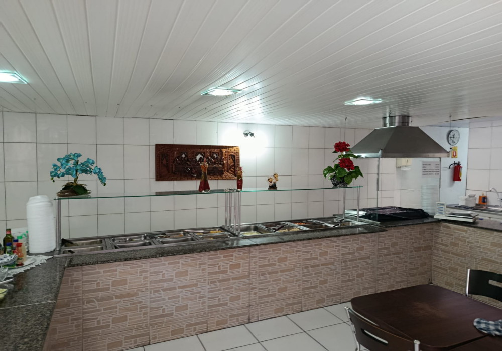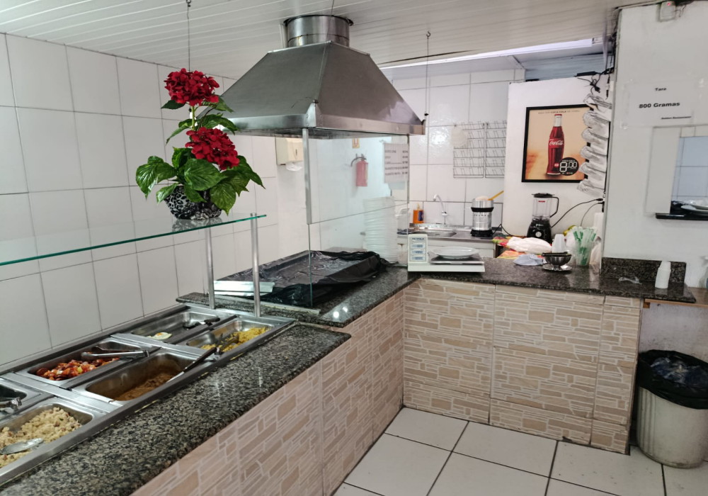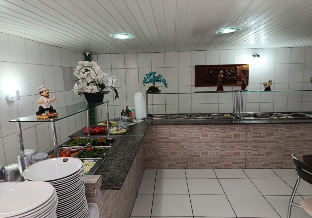 Serve em media 170 almoços ao dia, Restaurante na região central em esquina de fluxo intenso, possui.. 03 quadros decorativos, 5 painéis decorativos, 01 balcão de caixa e atendimento em madeira MDF em formato L , expositor para doces em vidro, 2 ventiladores de parede, televisor LCD 40 polegadas, 15 mesas com pés cromados e tampo em madeira MDF 2 lugares, 04 mesas com pés cromados e tampo em madeira MDF 4 lugares, 46 cadeiras com pés cromados e assento estofado, balcão em alvenaria com revestimento cerâmico tampo em granito para buffet aquecido/ buffet frio/ porta saladas/ porta pratos/ grill, fechamento em vidro para grill, chapa a gás para grill, balança digital, extrator de sucos, liquidificador, balcão para pia em madeira MDF, pia inox 1,20 mts, coifa inox para grill, buffet aquecido 16 cubas, buffet pista fria 6 cubas, refrigerador vertical panorâmico de bebidas duplo em comodato, cozinha muito bem equipada e estruturada com fogão industrial, fritadeira, pia inox, coifas. 2 placas externas de divulgação.