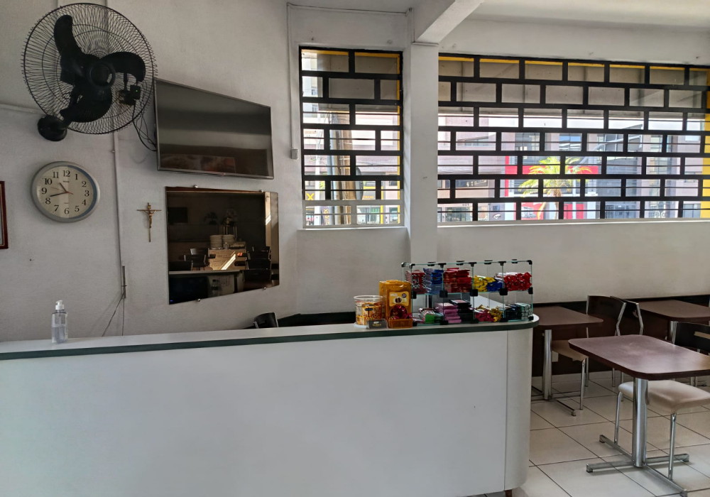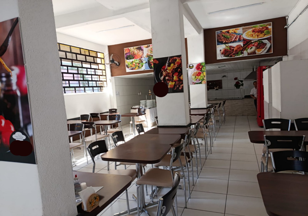 Serve em media 170 almoços ao dia, Restaurante na região central em esquina de fluxo intenso, possui.. 03 quadros decorativos, 5 painéis decorativos, 01 balcão de caixa e atendimento em madeira MDF em formato L , expositor para doces em vidro, 2 ventiladores de parede, televisor LCD 40 polegadas, 15 mesas com pés cromados e tampo em madeira MDF 2 lugares, 04 mesas com pés cromados e tampo em madeira MDF 4 lugares, 46 cadeiras com pés cromados e assento estofado, balcão em alvenaria com revestimento cerâmico tampo em granito para buffet aquecido/ buffet frio/ porta saladas/ porta pratos/ grill, fechamento em vidro para grill, chapa a gás para grill, balança digital, extrator de sucos, liquidificador, balcão para pia em madeira MDF, pia inox 1,20 mts, coifa inox para grill, buffet aquecido 16 cubas, buffet pista fria 6 cubas, refrigerador vertical panorâmico de bebidas duplo em comodato, cozinha muito bem equipada e estruturada com fogão industrial, fritadeira, pia inox, coifas. 2 placas externas de divulgação.
